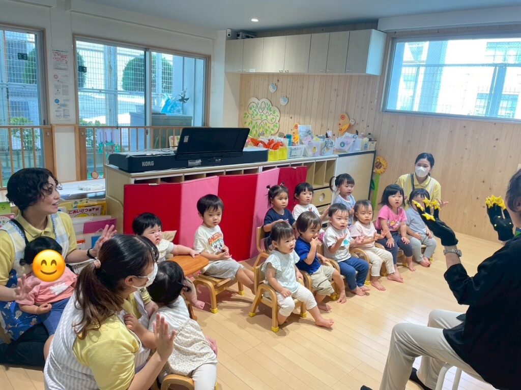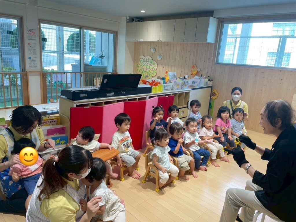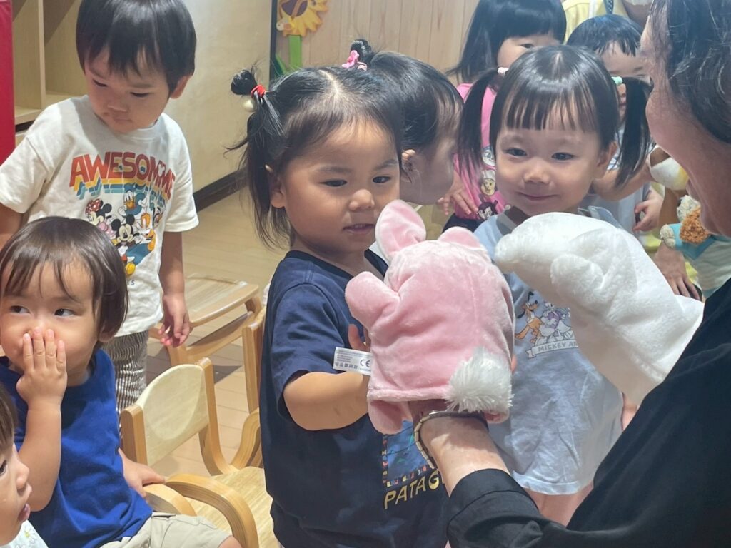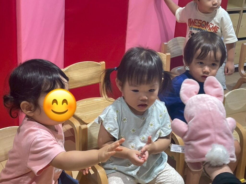 らんらんさん達の絵本の読み聞かせや手ぶくろシアターに興味津々で見つめる子ども達🤩