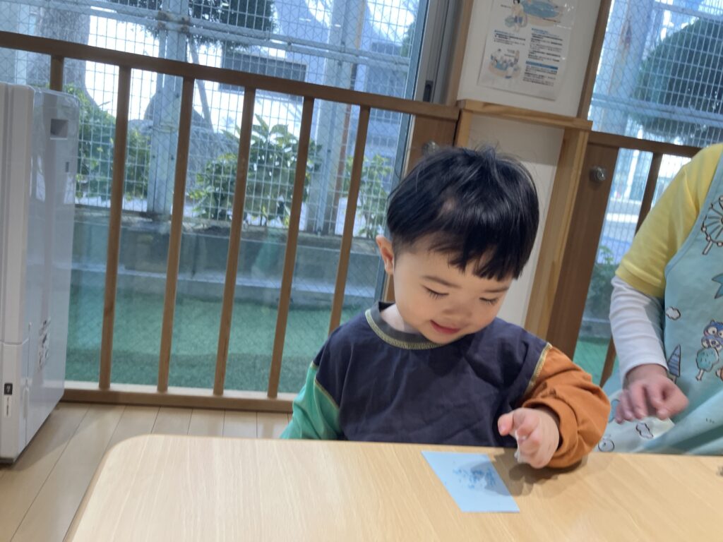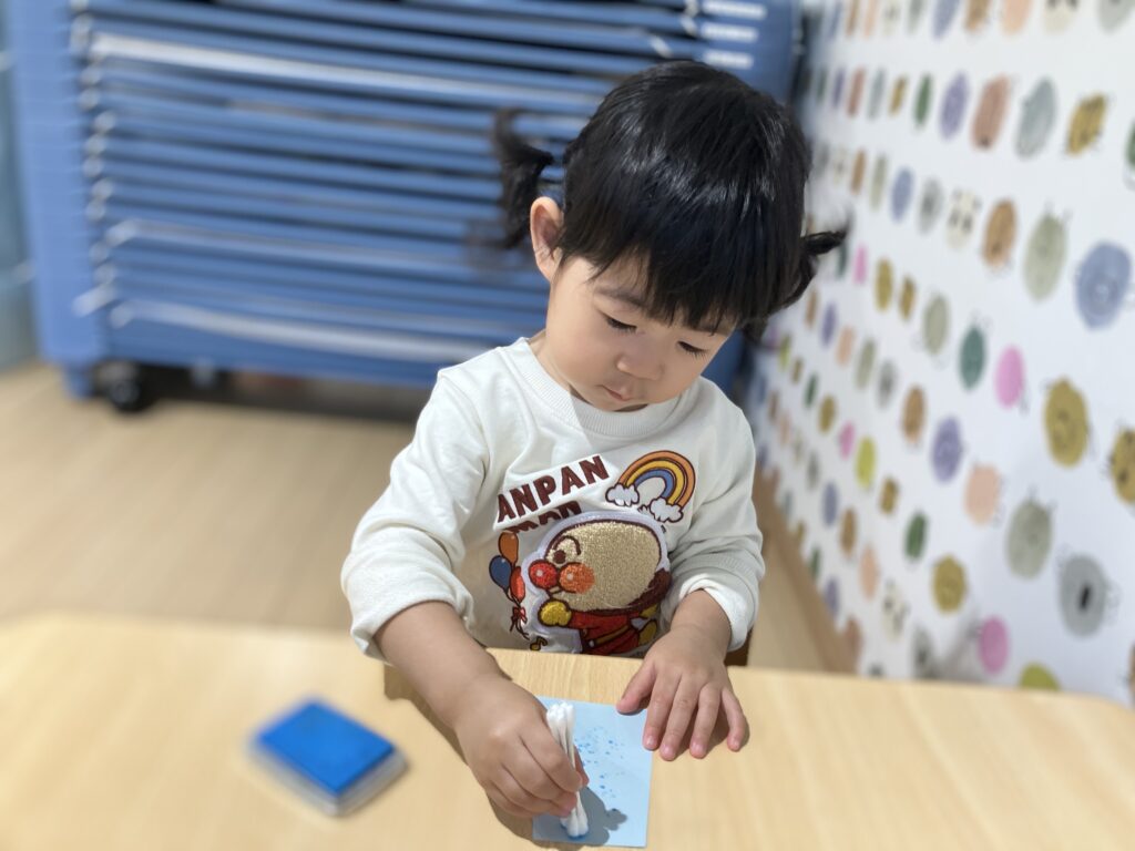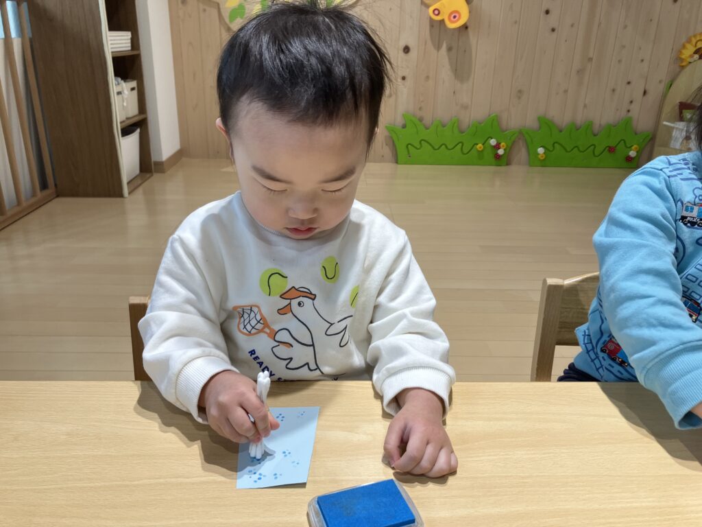 綿棒スタンプで花柄になっているのを見て「おはなだよ」と喜んでいましたよ😊