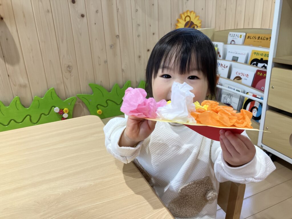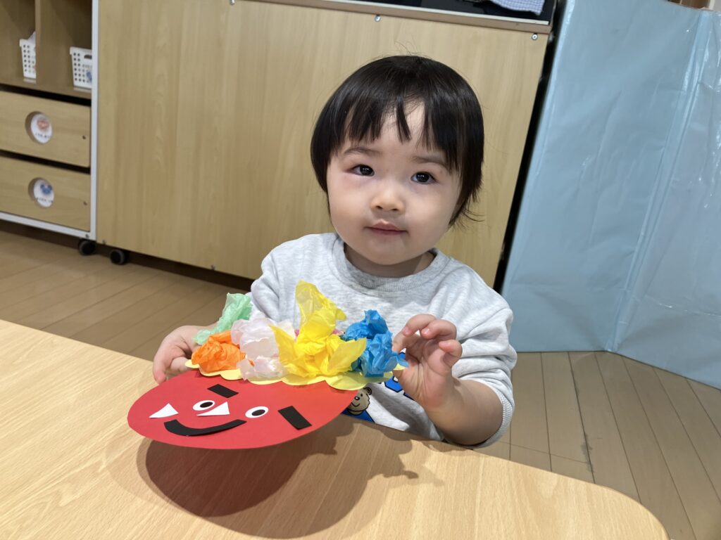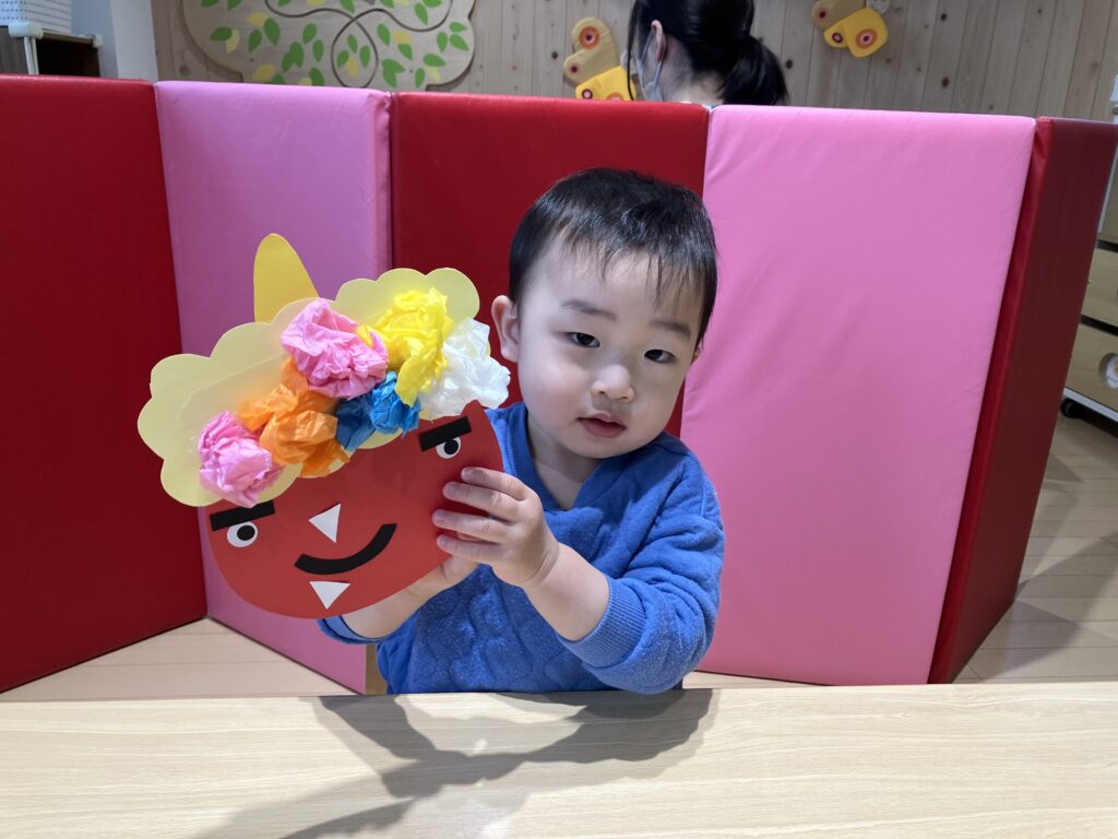 お面が出来上がって豆まき会を楽しみにしている子どもたちです😊