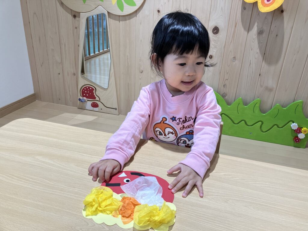 次は丸シールの目を「ここ?」と聞きながら貼ったり、「ここだ!」と言って貼っていましたよ🤭
