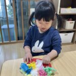 次は丸シールの目を「ここ?」と聞きながら貼ったり、「ここだ!」と言って貼っていましたよ🤭