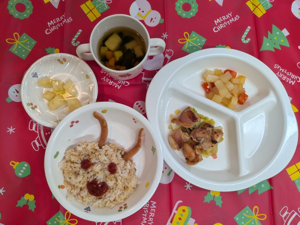 こんにちは! 調理員の根本です。12月の給食やおやつをご紹介します☆今月はクリスマスもあり、子供たちも楽しそうに食べる姿が見られ私も嬉しかったです。