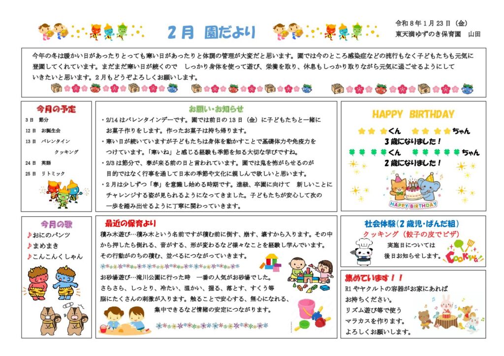 東天満ゆずのき保育園の2月園だよりです!